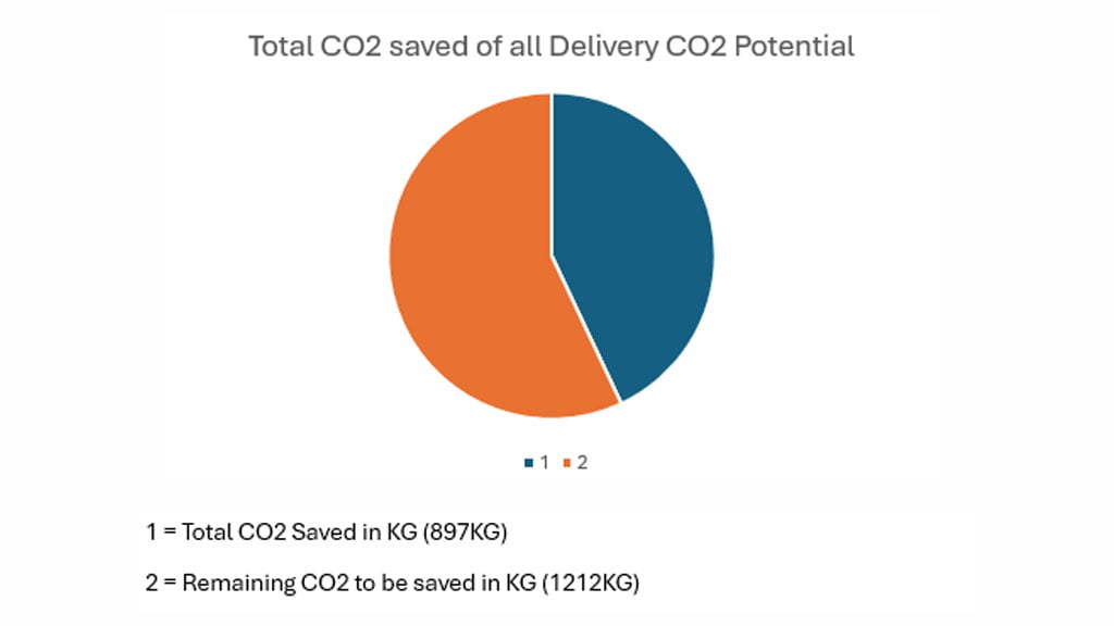 In total, we did 5607 miles without using trucks for deliveries, which saved a total of 897 kg of CO2, which equates to 43% of the carbon output of our study’s deliveries.