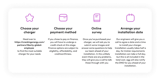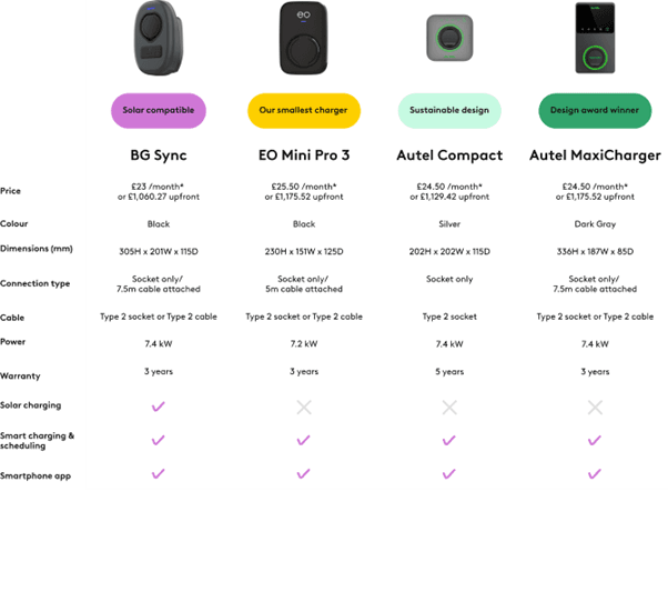 **EVC representative example Representative Example: Total price £1,106.37, Deposit £0.00, Total amount borrowed £1,106.37, Monthly Repayment £36.17, Total Amount Payable £1,302.07, Total Interest £195.71, Term of agreement 3 years/36 months at 10.9% APR Representative fixed. Price includes installation of EV charger at your home. No upfront costs apply to standard installations only. Additional fees may apply to non-standard properties or custom installations and lenders will disclose any applicable fees.