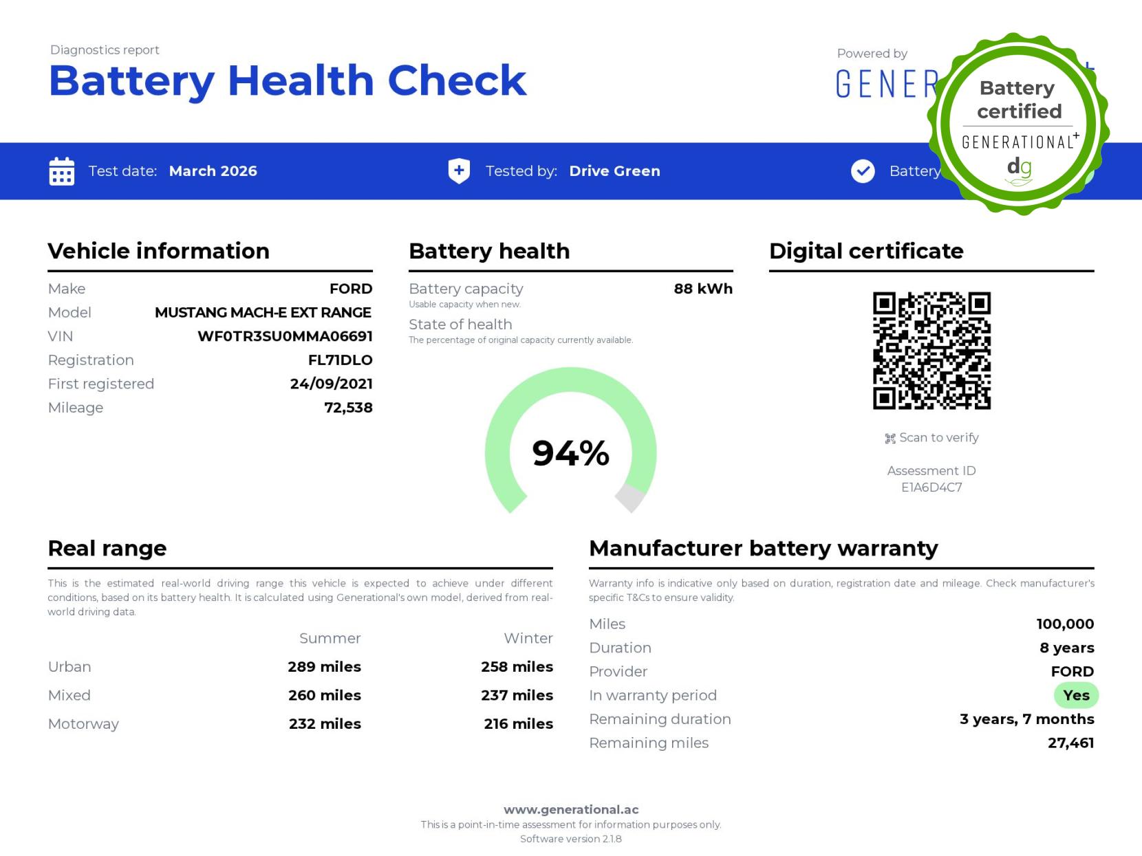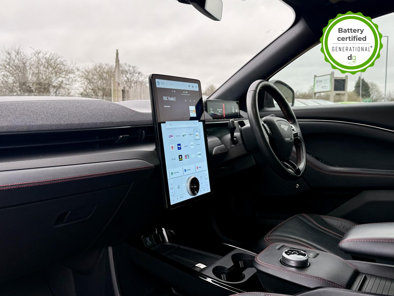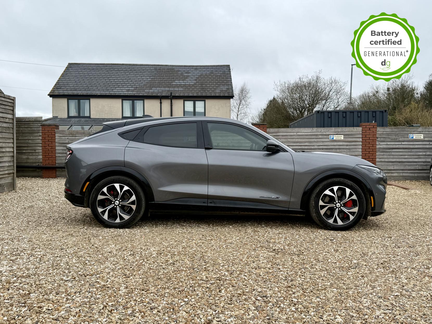 This stunning Mustang is in excellent condition and fully prepared to our high standard, has 2 keys, 1 previous owner, and it will be March 2027 until its next service or MOT is due. It is also showing an excellent 94% battery health. The Mustang Mach-E a stunning SUV with the style and road presence you would expect from a Mustang. It offers all the thrill of being a Mustang, but with an effortless and punchy electric drive, with an impressive motor power of 346 bhp and torque of 428 lbs/ft, this higher performance AWD model delivers the performance and feel you expect from a Mustang. The 88 kWh battery capacity gives an excellent long range of around 300 miles, depending on the time of year and your driving style, making it a very capable long-range EV. The battery can be fully charged at the right charging station, in just 45 minutes. It has plenty of premium spec, a great infotainment system and a quality build. It has LED lights, memory seats, heated front and rear seats, heated steering wheel, mustang-shaped puddle lights, wireless charging, over-the-air updates, adaptive cruise control, lane assist, motorised boot, and a 360o camera system and parking sensors. Unlike Car Supermarkets we have no hidden admin fees, there is no pressure selling, and we offer low finance rates. We also perform battery health checks on all our vehicles, so you can have the comfort of knowing the battery state of health of the EV you choose. Hopefully you will choose to buy your EV from Drive Green, as we are a multi award winning EV specialist and sustainable business, here to help you get the most from your switch to electric driving. Contact us to book an appointment to view and test drive this car, or to find out more about switching to electric driving, and to discuss purchase options, including buying on finance, and our remote buying and delivery service. We are also able to supply your home charge point also, making the switch to electric driving super easy for you. Drive Green is a true EV specialist and the UK’s biggest electric car only dealership, since 2017. FORECOURT VISITS AND TEST DRIVES BY APPOINTMENT ONLY.
