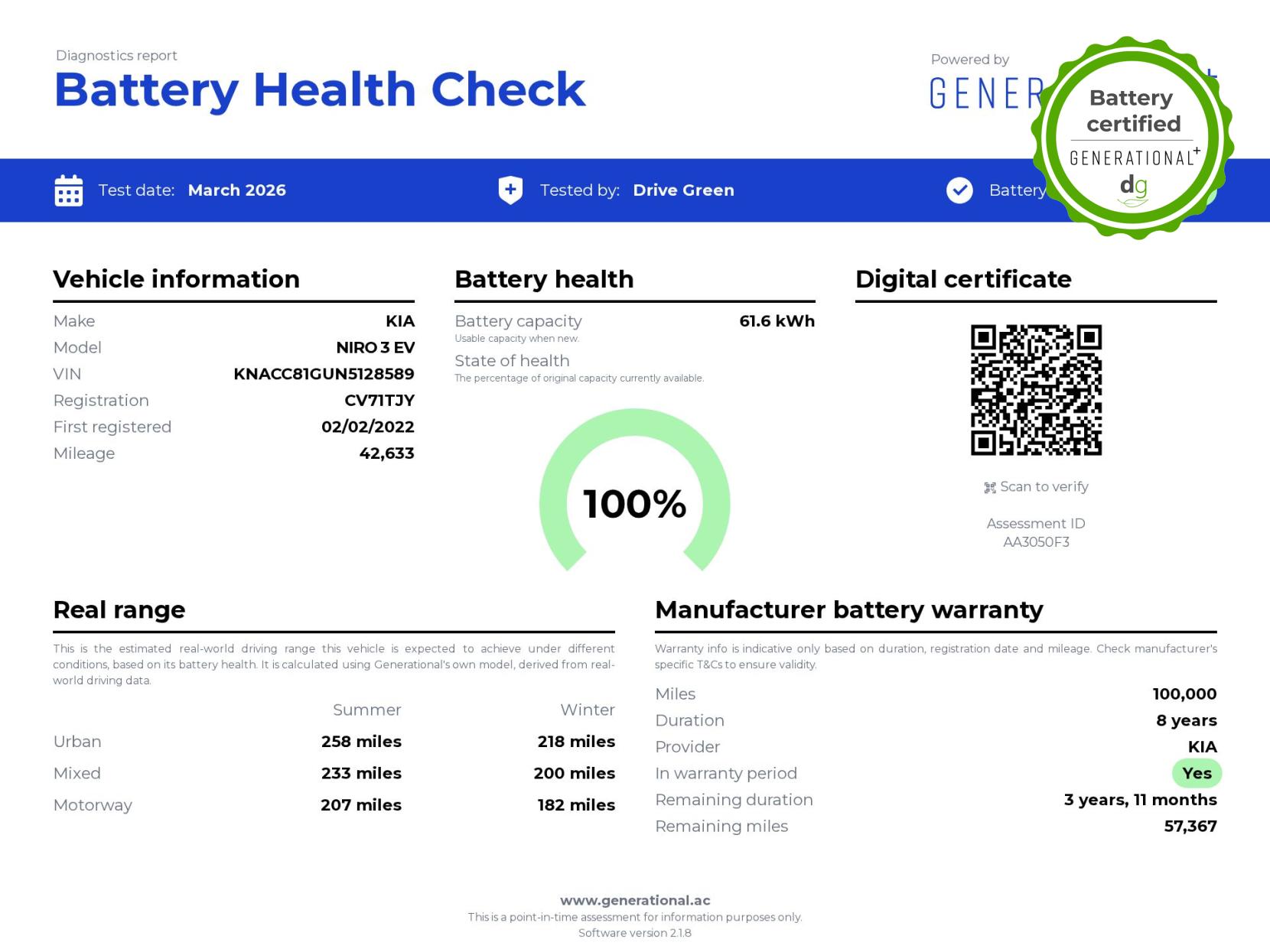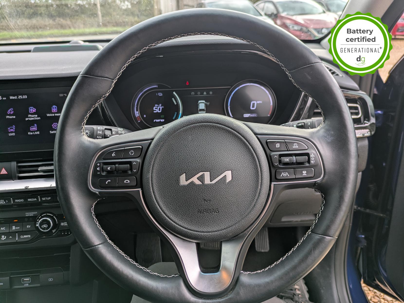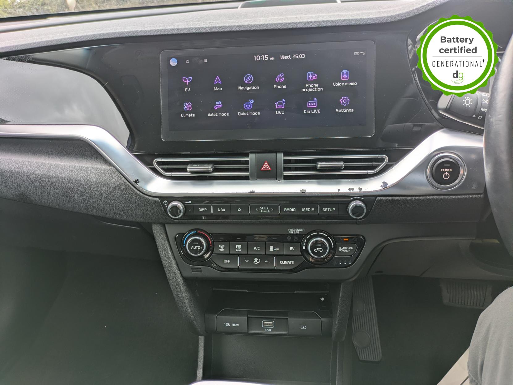 This E-Niro is in excellent condition and fully prepared to our high standard, has 2 keys, 1 previous owner, and it will have a minimum of 6 months until its next service and its MOT is due February 2027. It is also showing an excellent 100% battery health. The E-Niro is a great all-rounder – a generously sized and practical family EV, with a real-world range of around 250-300 miles, depending on your driving style and time of year. The level 3 E-Niro features some impressive spec. 17′ alloys, roof rails, power adjustable driver’s seat, and heated front seats. The E-Niro also features some great safety spec. If you are looking for an approachably priced, long range and practically sized family EV, this could be the perfect car for you. Unlike Car Supermarkets we have no hidden admin fees, there is no pressure selling, and we offer low finance rates. We also perform battery health checks on all our vehicles, so you can have the comfort of knowing the battery state of health of the EV you choose. Hopefully you will choose to buy your EV from Drive Green, as we are a multi award winning EV specialist and sustainable business, here to help you get the most from your switch to electric driving. Contact us to book an appointment to view and test drive this car, or to find out more about switching to electric driving, and to discuss purchase options, including buying on finance, and our remote buying and delivery service. We are also able to supply your home charge point also, making the switch to electric driving super easy for you. Drive Green is a true EV specialist and the UK’s biggest electric car only dealership, since 2017. FORECOURT VISITS AND TEST DRIVES BY APPOINTMENT ONLY.